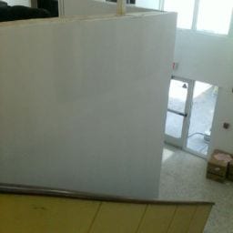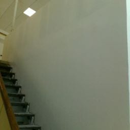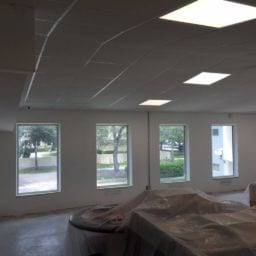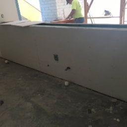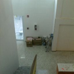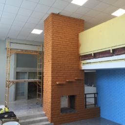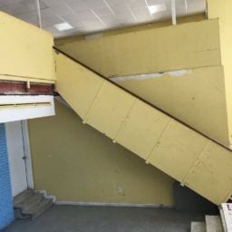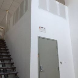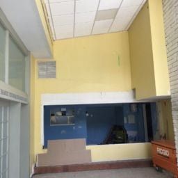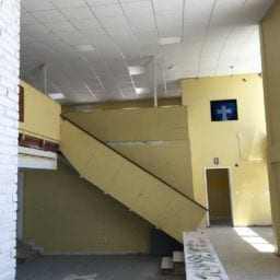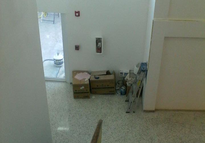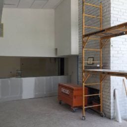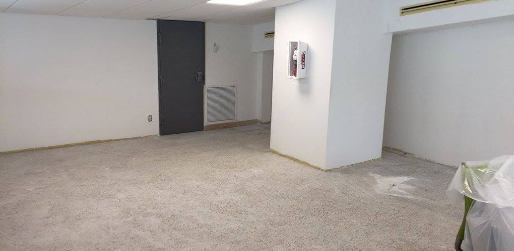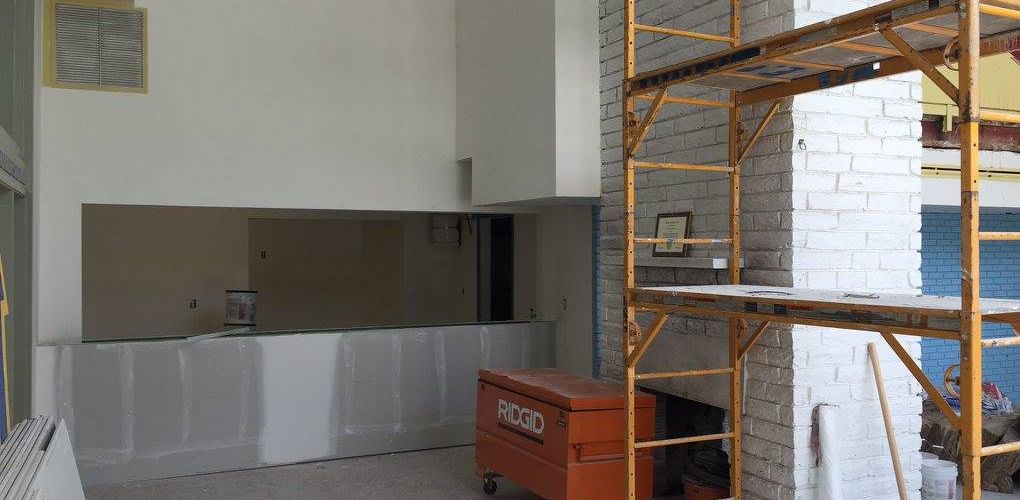 As part of this project, all damaged walls were repaired and the HVAC unit doors were upgraded to meet the fire code. We also removed the old kitchen steam table and dishwasher due to rust and mold. The serving area was rebuilt and the knee wall in the loft was adjusted up to meet code requirements. New paint and refinishing of the original terrazzo floors were completed to finish off the project.